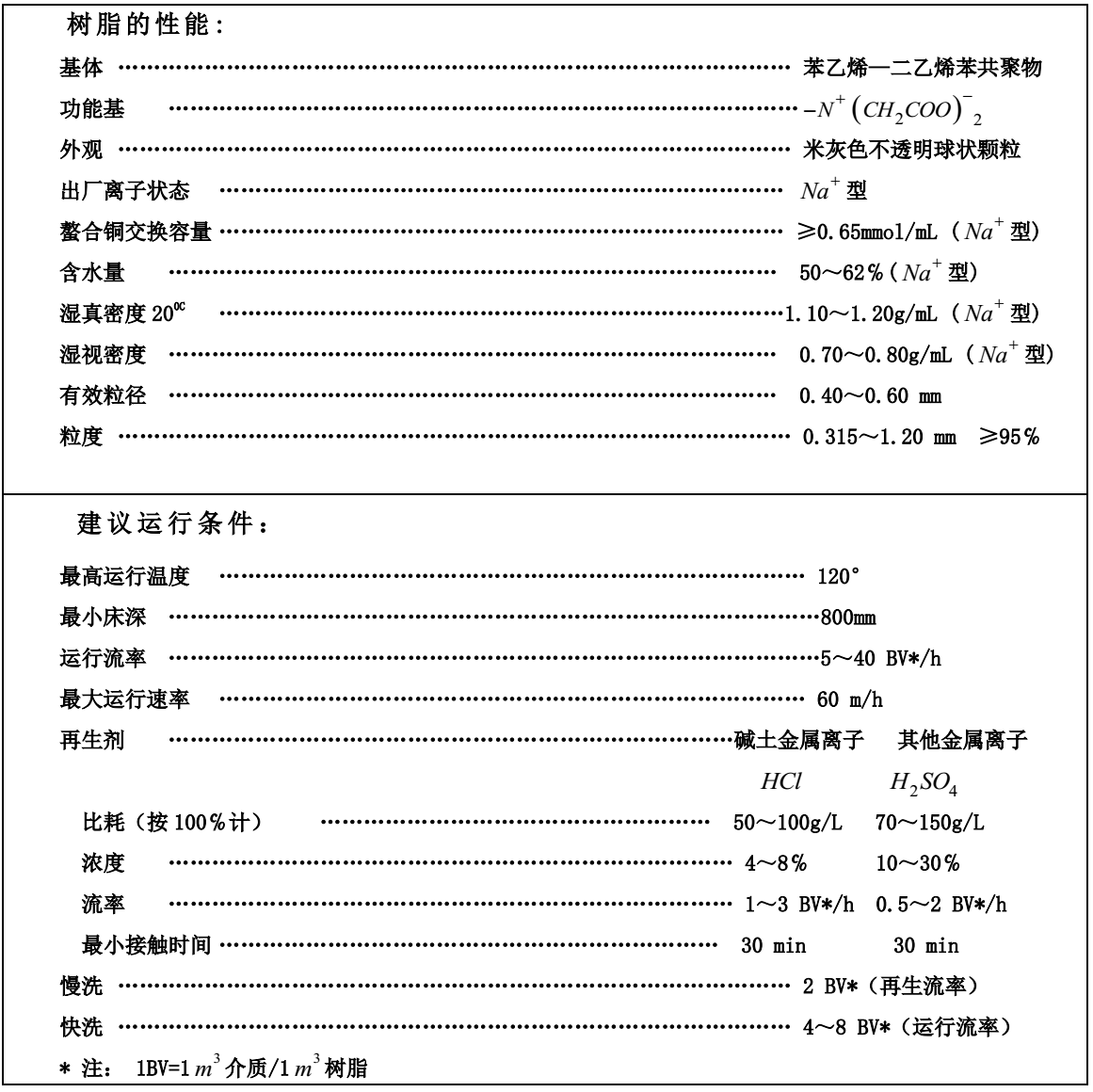 D403是含有亚胺二乙酸螯合基的大孔苯乙烯系离子交换树脂,能与金属离子形成多配位络合物。它在一阶和二阶金属离子溶液中,仅与二阶金属离子形成稳定络合物。它的结构非常牢固,化学稳定性好,网孔度高,螯合容量大,用于氯碱工业离子膜法制碱的食盐税种除钙、镁杂质。特别在废水领域(在铜、镍废水方面)得到广泛的运用。